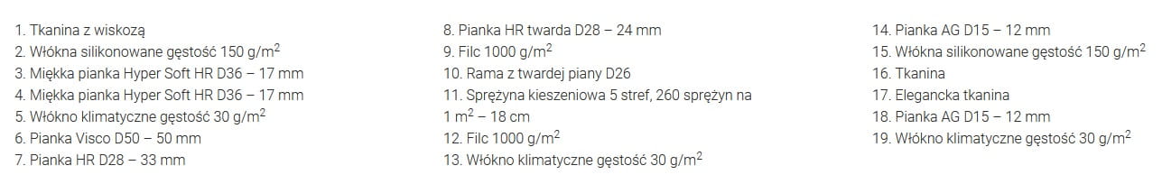 Piana HR to sprężystość, stabilność i wygoda w jednym. Materiał miękki i plastyczny. Ze względu na swoją wyjątkowo trwałą strukturę z najczęściej wybieranych rodzajów pian.