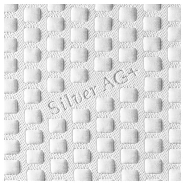Pokrowiec poduszki w tkaninie SILVER AG+ o bardzo wysokiej gramaturze wynoszącej 500 gr/m². Niewątpliwą jej zaletą jest zawartość jonów srebra, działających antybakteryjnie i antystatycznie. Jony srebra hamują również namnażanie się roztoczy i rozwijanie pleśnie, a także przeciwdziałają powstawaniu brzydkich zapachów. Srebro usuwa ładunki elektrostatyczne gromadzących się na naszej skórze poprzez kontakt z sytetykami, co sprawia, że szybciej się relaksujemy, a dzięki temu dłużej efektywnie wypoczywamy. Tkanina SIlver AG+ posiada na swojej powierzchni włókna lyocellowe, które sprawiają, że jest ona bardzo wytrzymała, zachowując jednocześnie wyjątkową delikatność w kontakcie ze skórą. Obecność włókien lyocellowych wpływa również korzystnie na pochłanianie przez pokrowiec wilgoci i zapobiega jej przenikaniu do wnętrza, co przekłada się na zachowanie czystości poduszki. Biorąc pod uwagę wszystkie właściwości tkaniny SILVER AG+ szczególnie poleca się ją osobom wrażliwym na wszelkie podrażnienia skórne i alergie. Tkanina zachowuje swoje właściwości antybakteryjne i antystatyczne nawet po 5 praniach. Maksymalna temperatura prania nie powinna być wyższa niż 40° C