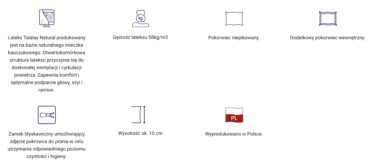 Oddychająca poduszka ergonomiczna, niwelująca szereg dolegliwości, zapewniająca prawidłową pozycję w czasie spoczynku, dbająca o komfort snu. Wkład poduszki stanowi 100 % naturalny lateks wykonany w technologii Talalay. Zapewnia bardzo dobrą cyrkulację powietrza, umożliwia oddychanie. Nie odkształca się. Dostępna w pokrowcach niepikowanych.