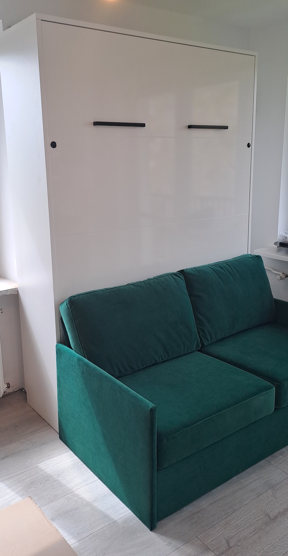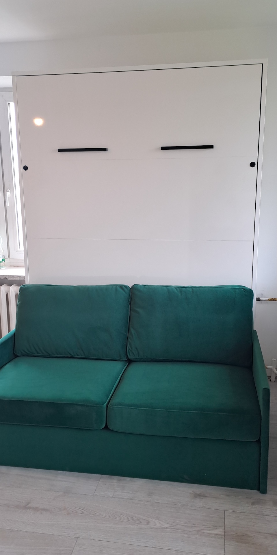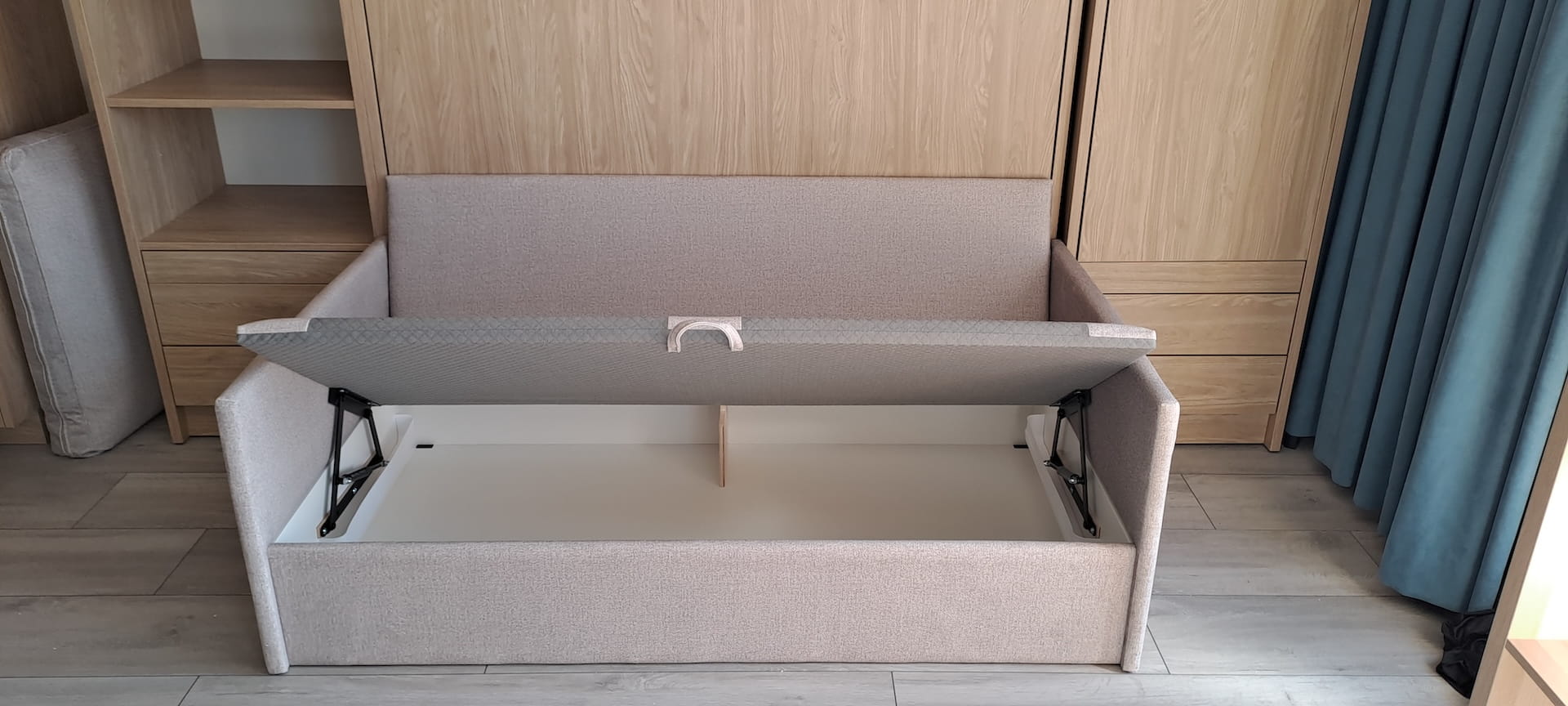 Nowością jest sofa, która znajduje się przed półkotapczanem i z której można korzystać, gdy półkotapczan jest zamknięty. Sofa nie przeszkadza w swobodnym otwieraniu i rozkładaniu łóżka, a jej poduszki oparciowe mogą służyć jako wygodne oparcie przy rozłożonym półkotapczanie. Sofa posiada pojemnik na pościel lub inne rzeczy. Dostępna jest od ręki w pięciu kolorach, ale istnieje również możliwość zamówienia jej w dowolnej tkaninie z naszej oferty – wtedy czas realizacji jest dłuższy.Oferta sofy w pozostałych tapicerkach dostępna na stronie Sofa Genius. To rozwiązanie idealne do niewielkiego pokoju, gdzie po złożeniu łóżka powstaje spora przestrzeń potrzebna do codziennego życia, doskonałe np. do pokoju nastolatka.