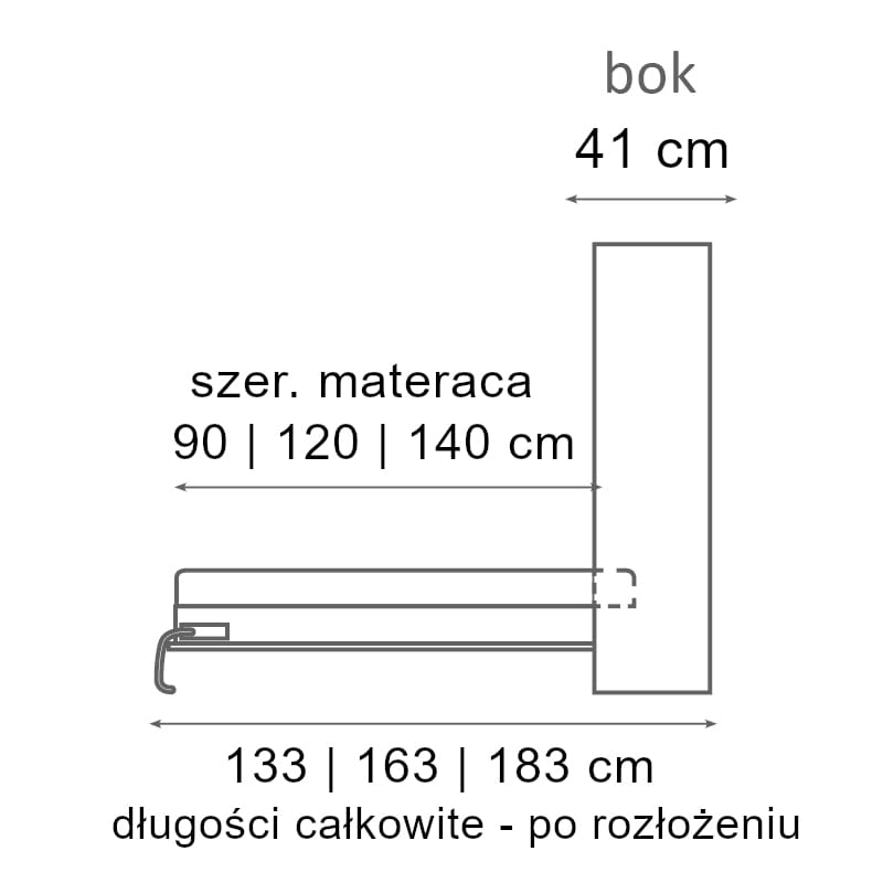 - Głębokość całkowita przy złożonym łóżku: 41 cm