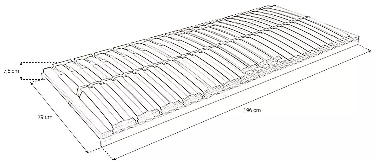 Szerokość: 80 cm, 90 cm, 100 cm, długość: 190 i 200 cm; stelaż jest na długości o 4 cm krótszy, natomiast na szerokości jest węższy o 1 cm, np. 80 cm x 200 cm=>79 cm x 196 cm. Cena stelaża o długości 190 cm taka jak 200 cm. Cena stelaża o szerokości 70 cm taka jak 80 cm. Grubość: 7,5 cm.