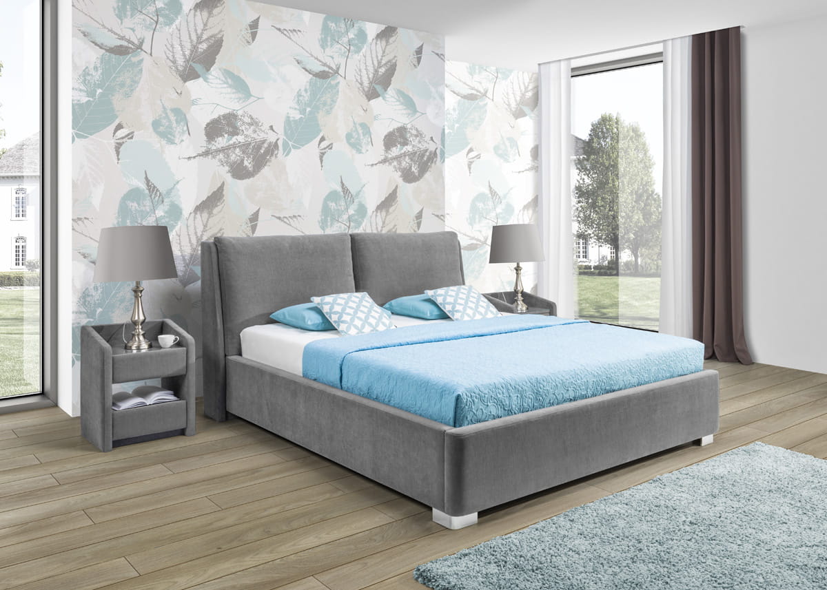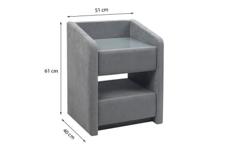 Praktyczny, bardzo wysoki, tapicerowany stolik (szafka nocna) z dwoma szufladami i wygodną półką pomiędzy nimi. Blat pokryty transparentnym szkłem, otoczony wyższymi brzegami zapobiegającymi spadaniu przedmiotów.Pasujący do łóżek kontynentalnych oraz łóżek tapicerowanych firmy New Elegance.
