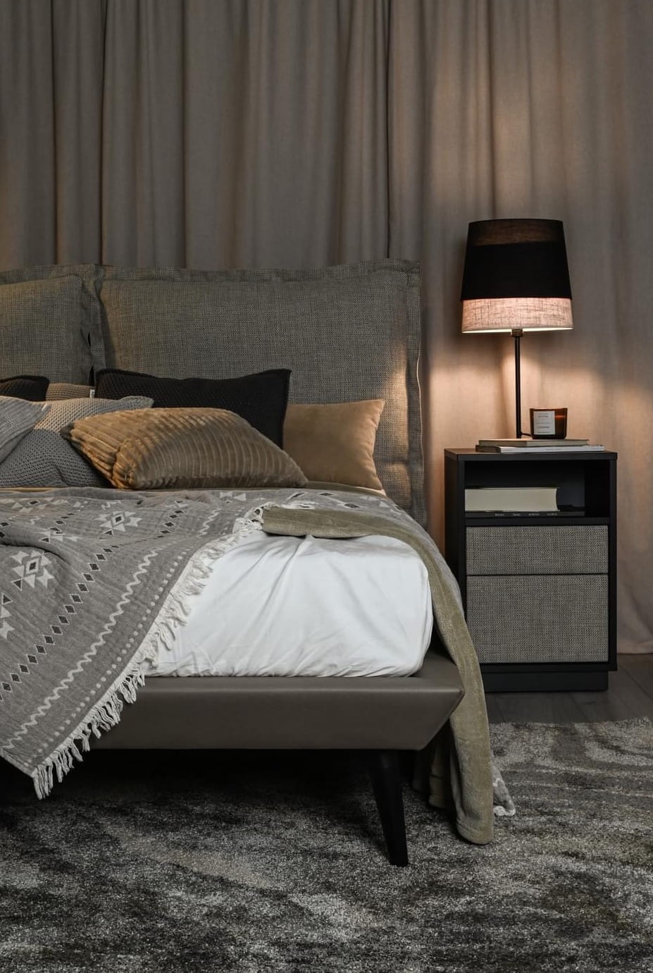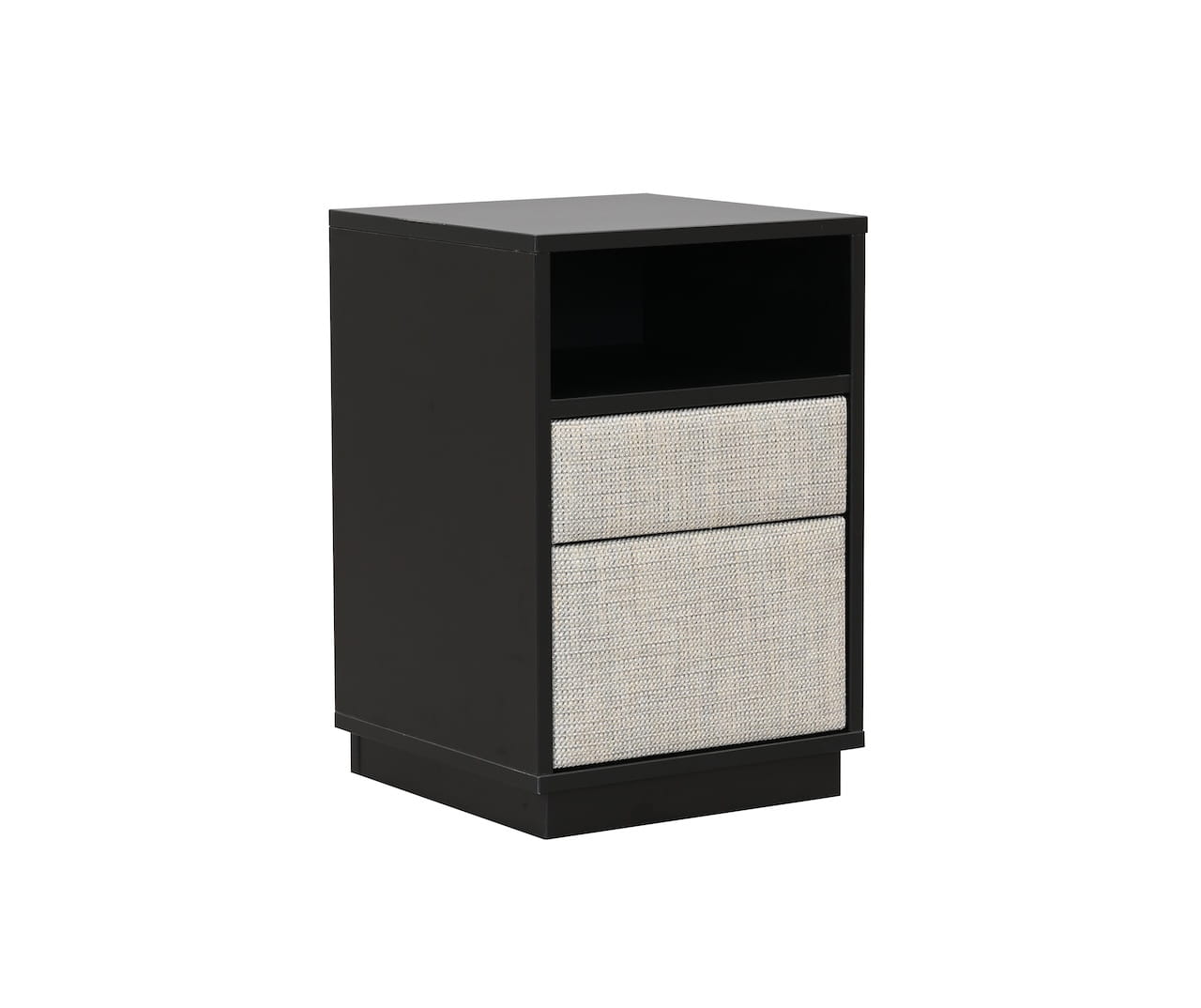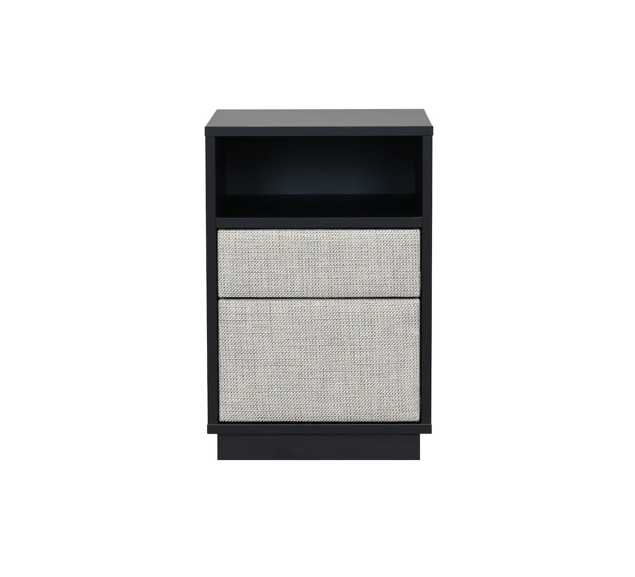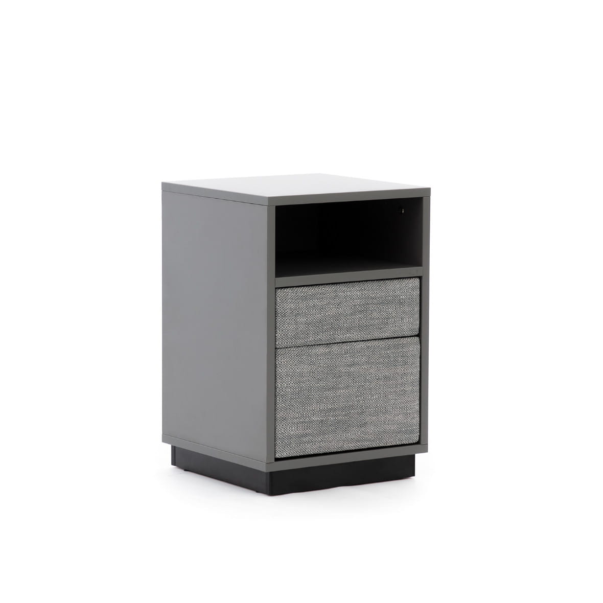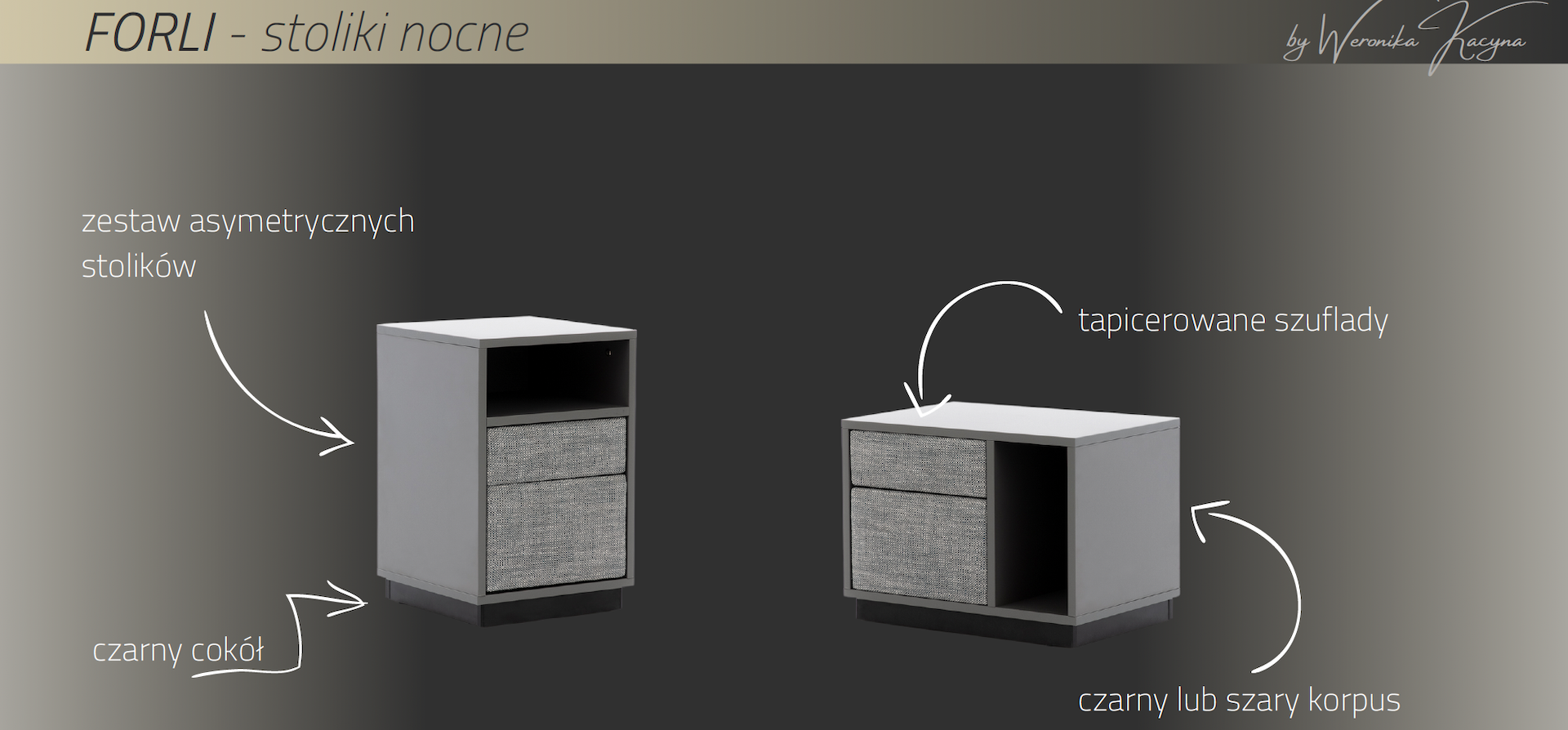 wykonany z płyty w kolorze szarym lub czarnym w połączeniu z tapicerowanymi frontami szuflad.Stolik idealnie pasuje do pozostałych mebli z kolekcji Forli: łóżka, stolika poziomego oraz ławki.