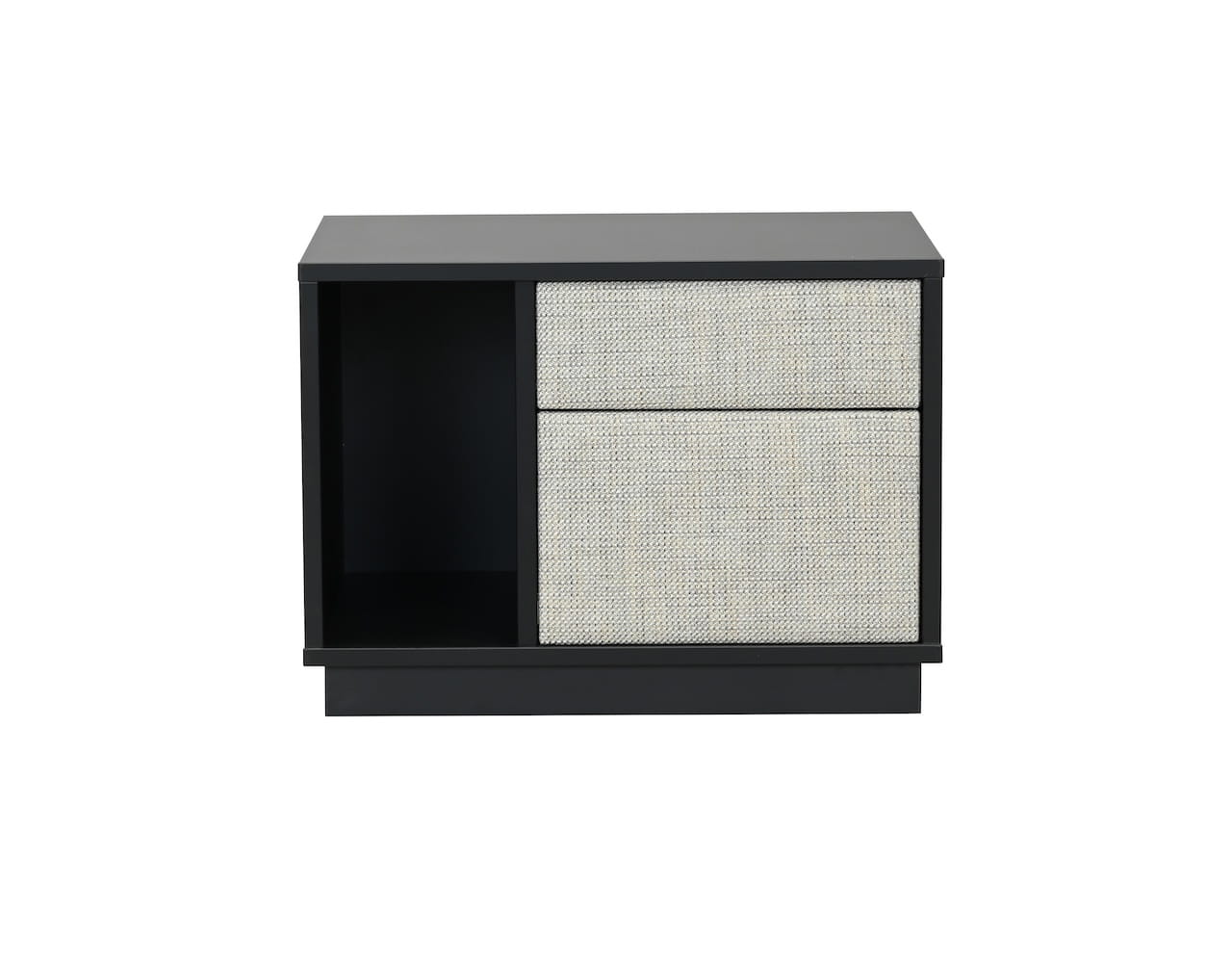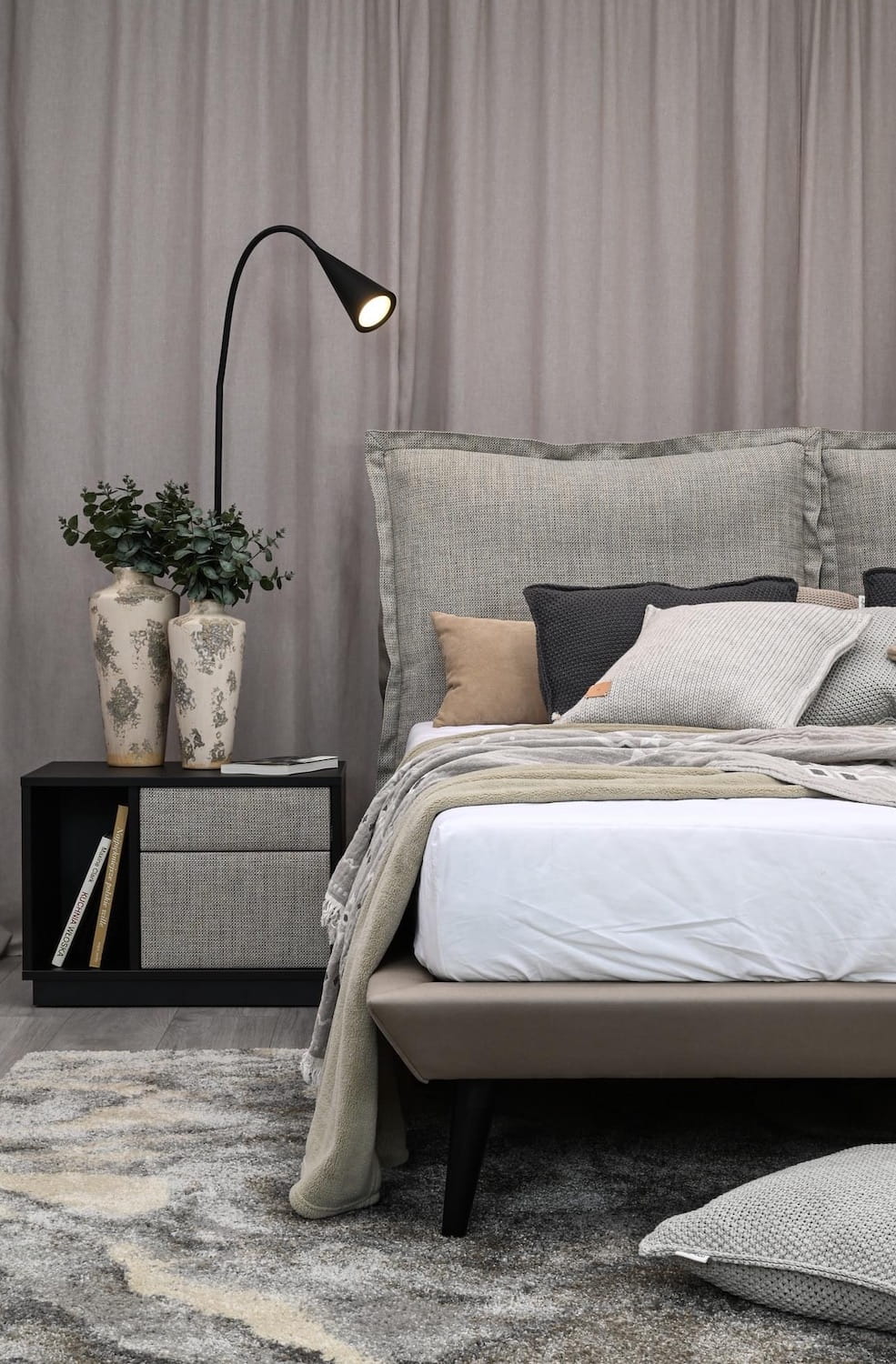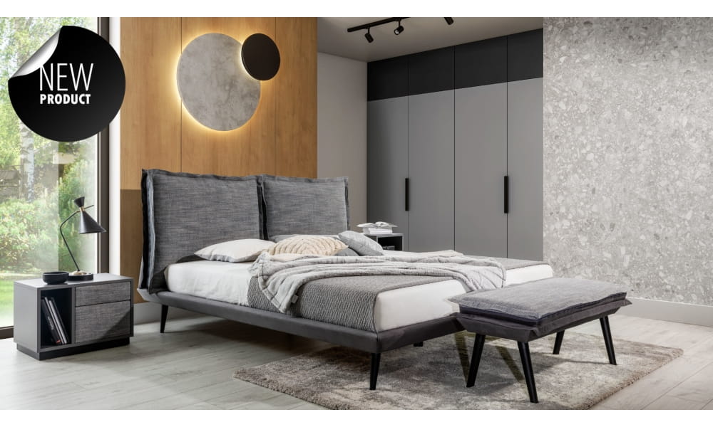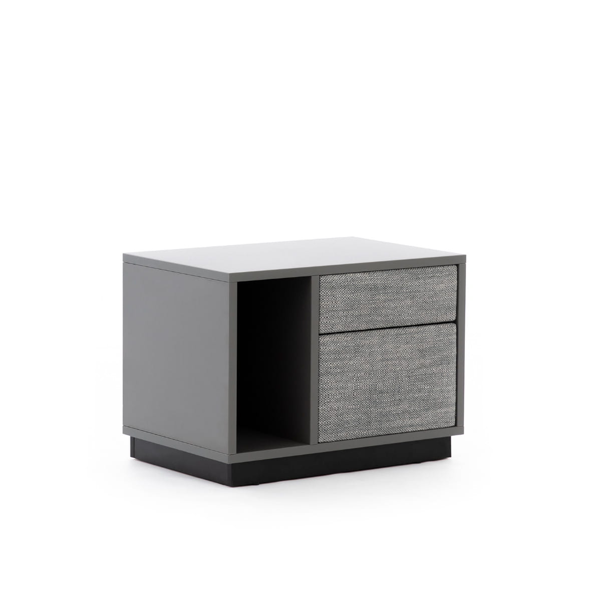 wykonany z płyty w kolorze szarym lub czarnym w połączeniu z tapicerowanymi frontami szuflad.Stolik idealnie pasuje do pozostałych mebli z kolekcji Forli: łóżka, stolika pionowego oraz ławki.