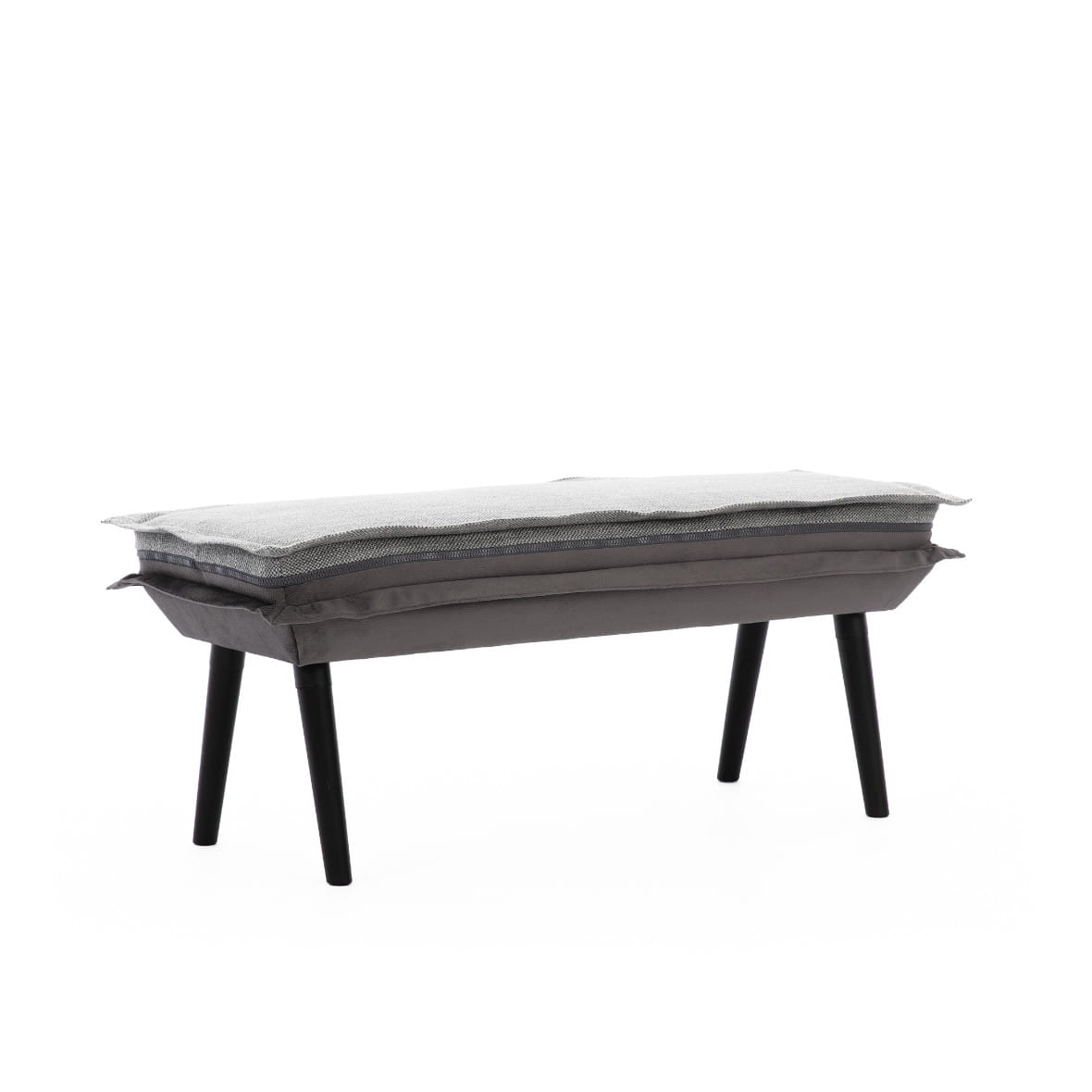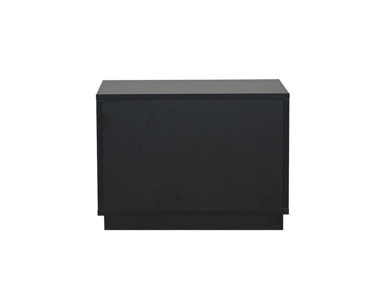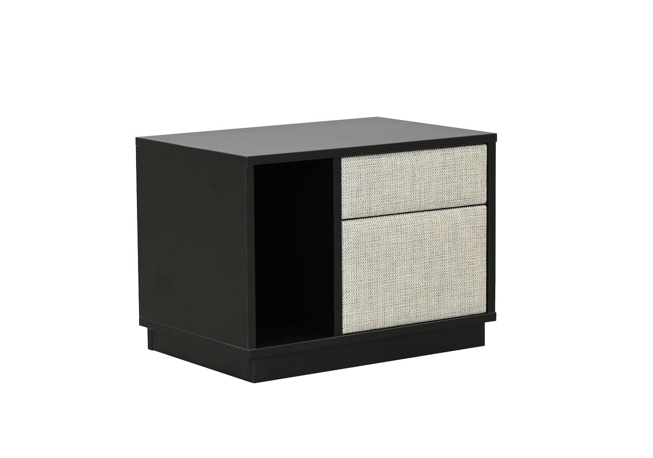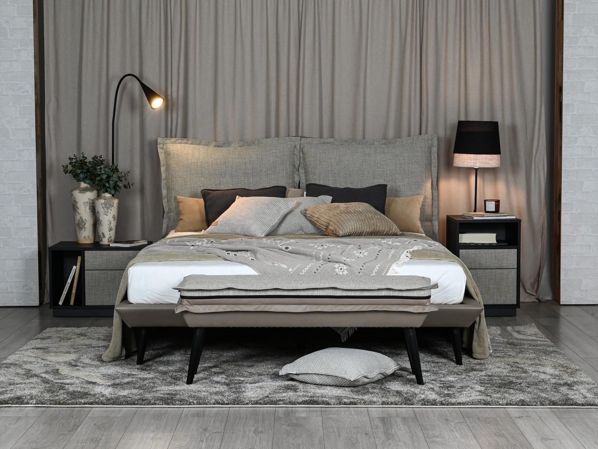 wykonany z płyty w kolorze szarym lub czarnym w połączeniu z tapicerowanymi frontami szuflad.Stolik idealnie pasuje do pozostałych mebli z kolekcji Forli: łóżka, stolika pionowego oraz ławki.