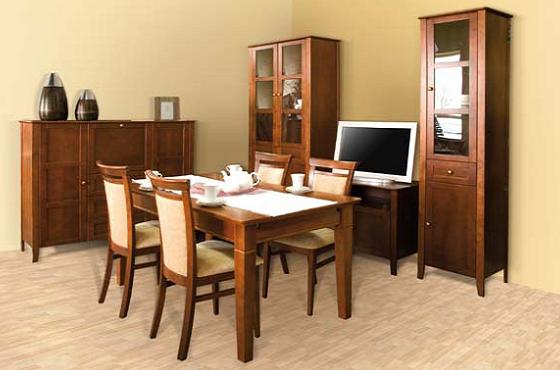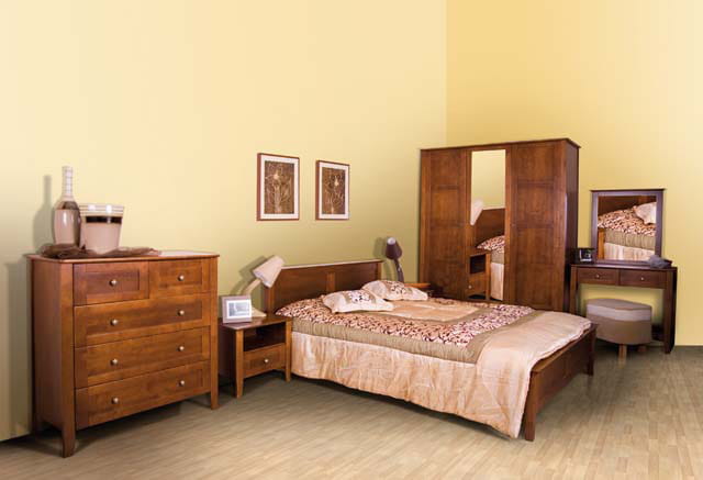 Zestaw Amelia ujmują delikatną stylistyką i lekkością. Mimo że należą do nurtu klasycznego to jednak nie przytłaczają nadmierną ilością ozdób. Lekko wygięte nogi są przedłużeniem bocznych listew ozdobnych biegnących do samego blatu, który ma zaokrąglone krawędzie i rogi. Naturalne piękno drewna podkreśla charakterystyczne dla brzozy usłojenie a całość wykończona jest w ciepłym orzechowym kolorze. Postarzane, mosiężne okucia są również niezwykle subtelne idealnie pasując do kształtu komód.