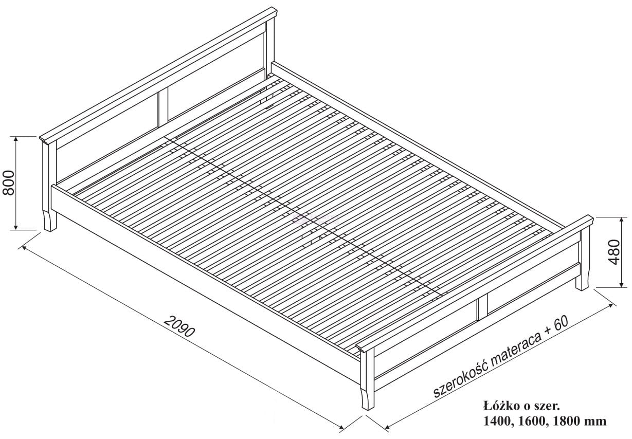 - Łóżko: szer.materaca 140 | 160 | 180 cm; szerokość zewnętrzna: +6 cm do materaca, wys. wezgłowia 80 cm; gł. 209 cm