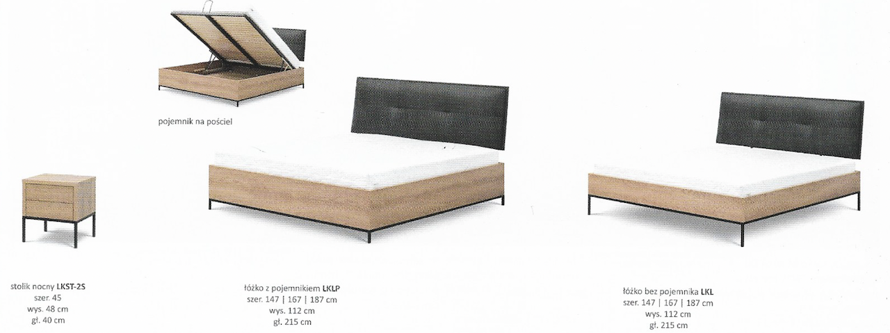 • łóżko z pojemnikiem LKLP w rozmiarach:szer.147/167/187 cm (na materac: 140, 160 i 180 cm) x gł. 215 cm x wys. 112 cm (wysokość nogi: 8 cm ; wysokość korpusu: 32 cm)