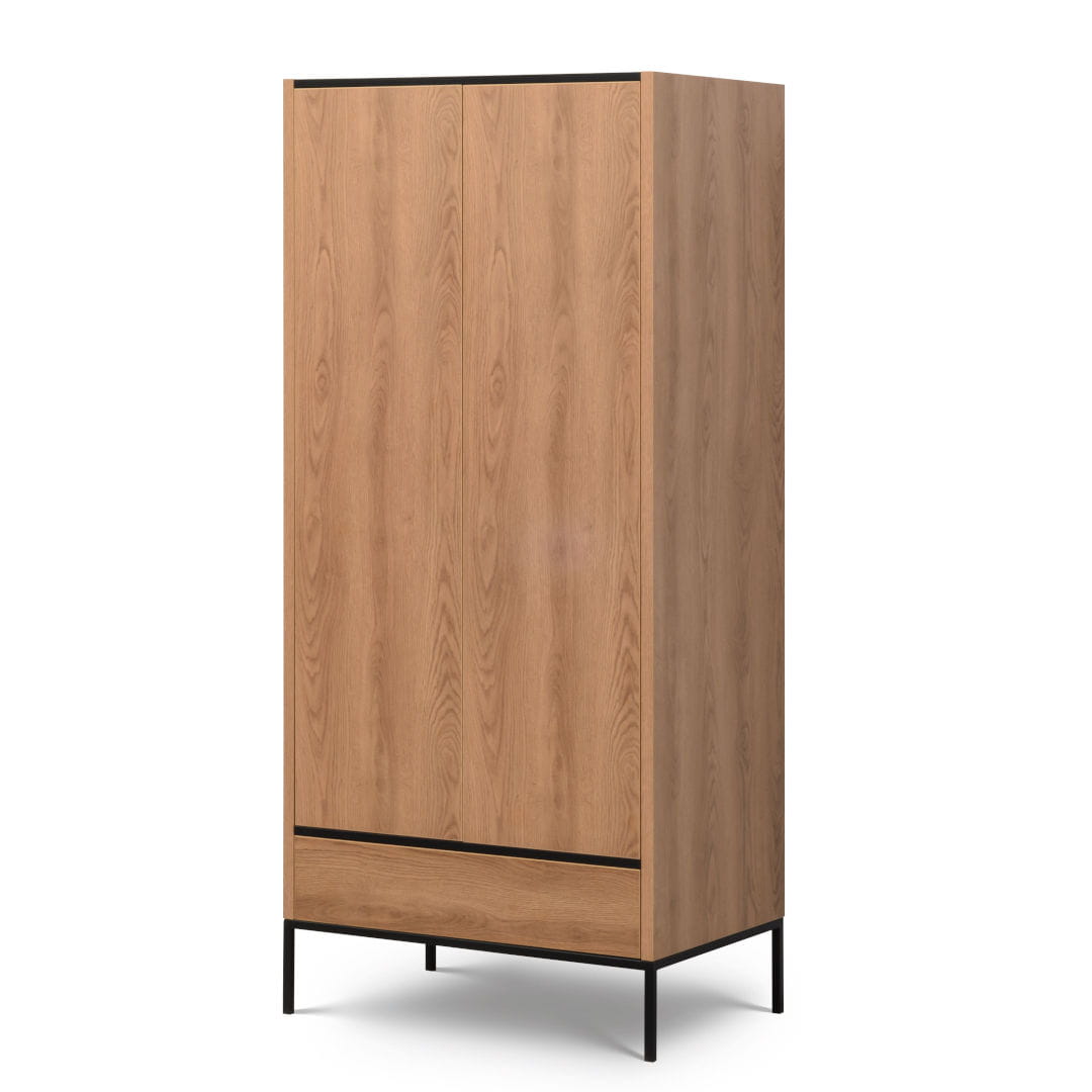 Nowoczesna, minimalistyczna kolekcja mebli do sypialni wykonanych z bardzo szlachetnej, matowej płyty meblowej w odcieniu karmelowego dębu, o wyraźnej strukturze usłojenia, bardzo przypominającej zarówno wizualnie jak i w dotyku naturalne dębowe drewno. Podstawę kolekcji stanowią czarne, malowane proszkowo, bardzo solidne metalowe konstrukcje, do których nawiązuje kolor okleiny na szafach. Tapicerowane wezgłowie łóżka w oryginalnej, przecieranej czarnej tkaninie dobrze komponuje się z metalowymi elementami. W skład zestawu wchodzą: łóżko bez pojemnika lub z pojemnikiem w trzech różnych rozmiarach, szafa dwudrzwiowa, komoda z szufladami, bardzo praktyczny wieszak z szufladami oraz stoliki nocne.
