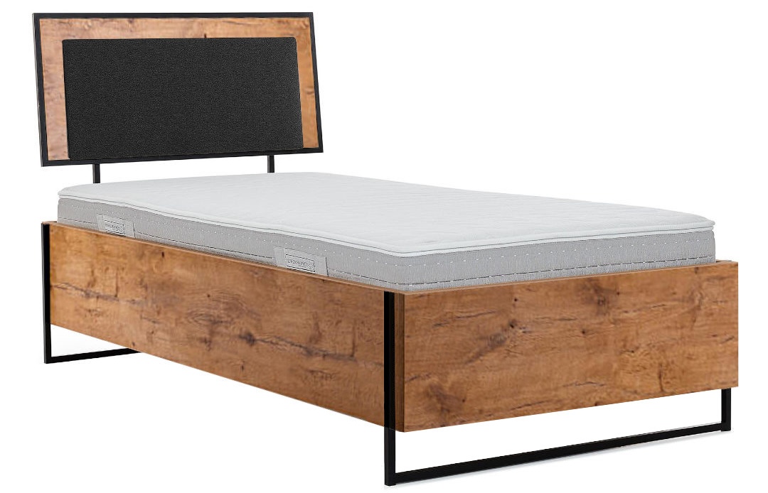 Loftowe łóżko z płyty meblowej z dekorem ciepłego, postarzanego dębu. Wygodny, częściowo tapicerowany i pochylony zagłówek ujety w czarną, metalową ramę malowaną proszkowo. Skrzynia z pojemnikiem wsparta na czarnych, ozdobnych elementach doskonale komponujacych się z wezgłowiem.