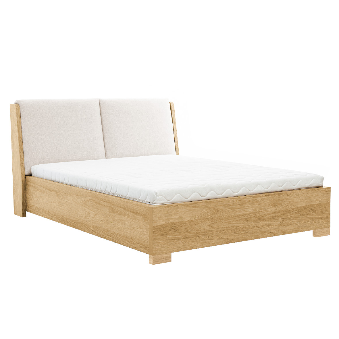 Eleganckie łóżko ze szlachetnej, laminowanej płyty meblowej z dekorem jasnego dębu Baltic Dune i wygodnym, pochylonym wezgłowiem z dwoma miękkimi poduchami dostępnymi w trzech kolorach. Grubość płyty meblowej 3,8 cm. Matowa, przyjemna w dotyku powierzchnia przypomina naturalne drewno. Poduchy wykonane z tkaniny o strukturze plecionki.