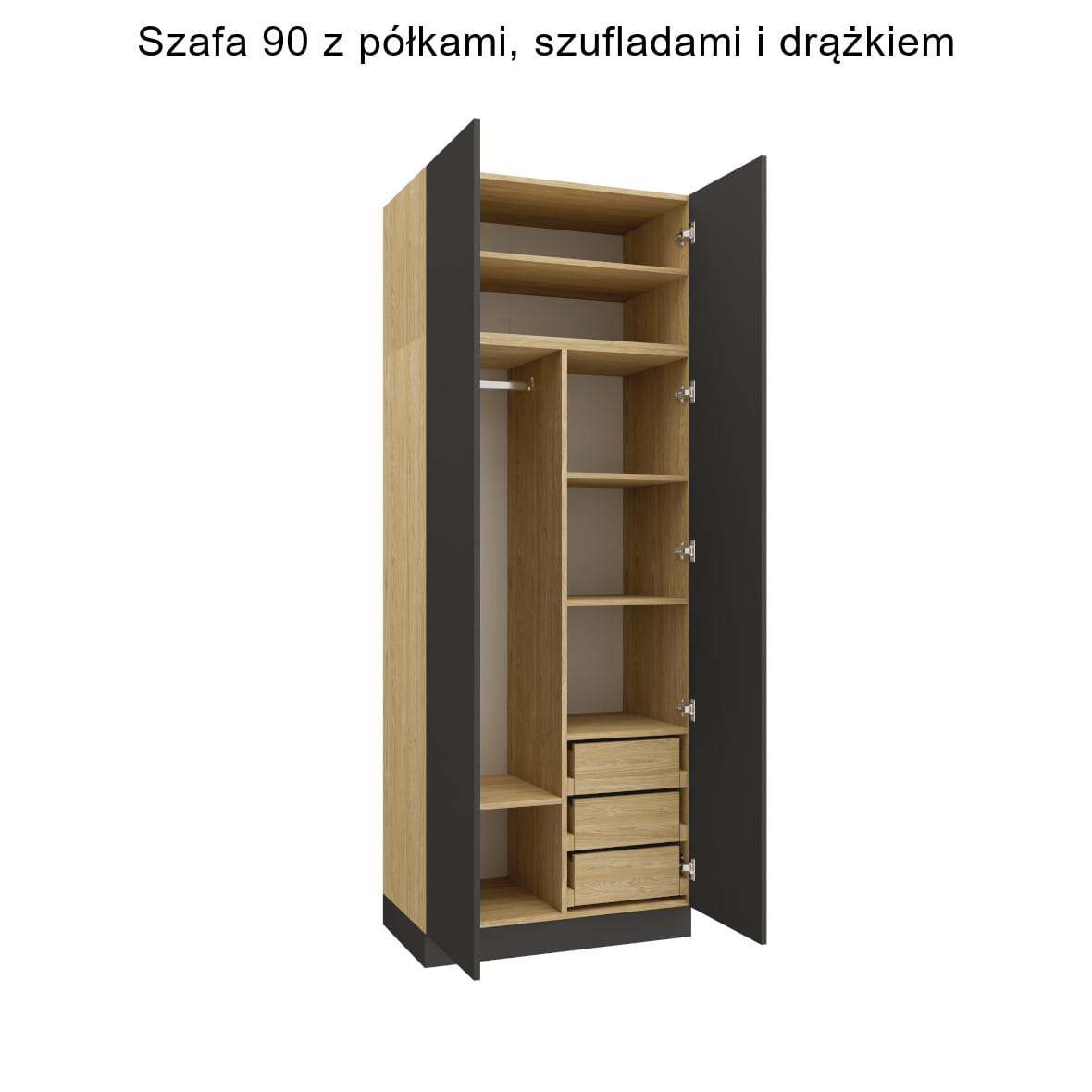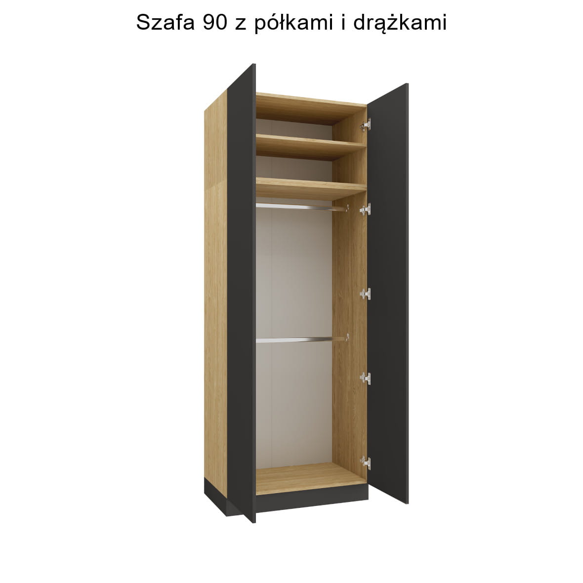 - szafa dwudrzwiowa z półkami, szufladami wewnętrznymi i drążkiem, szer. 90 cm