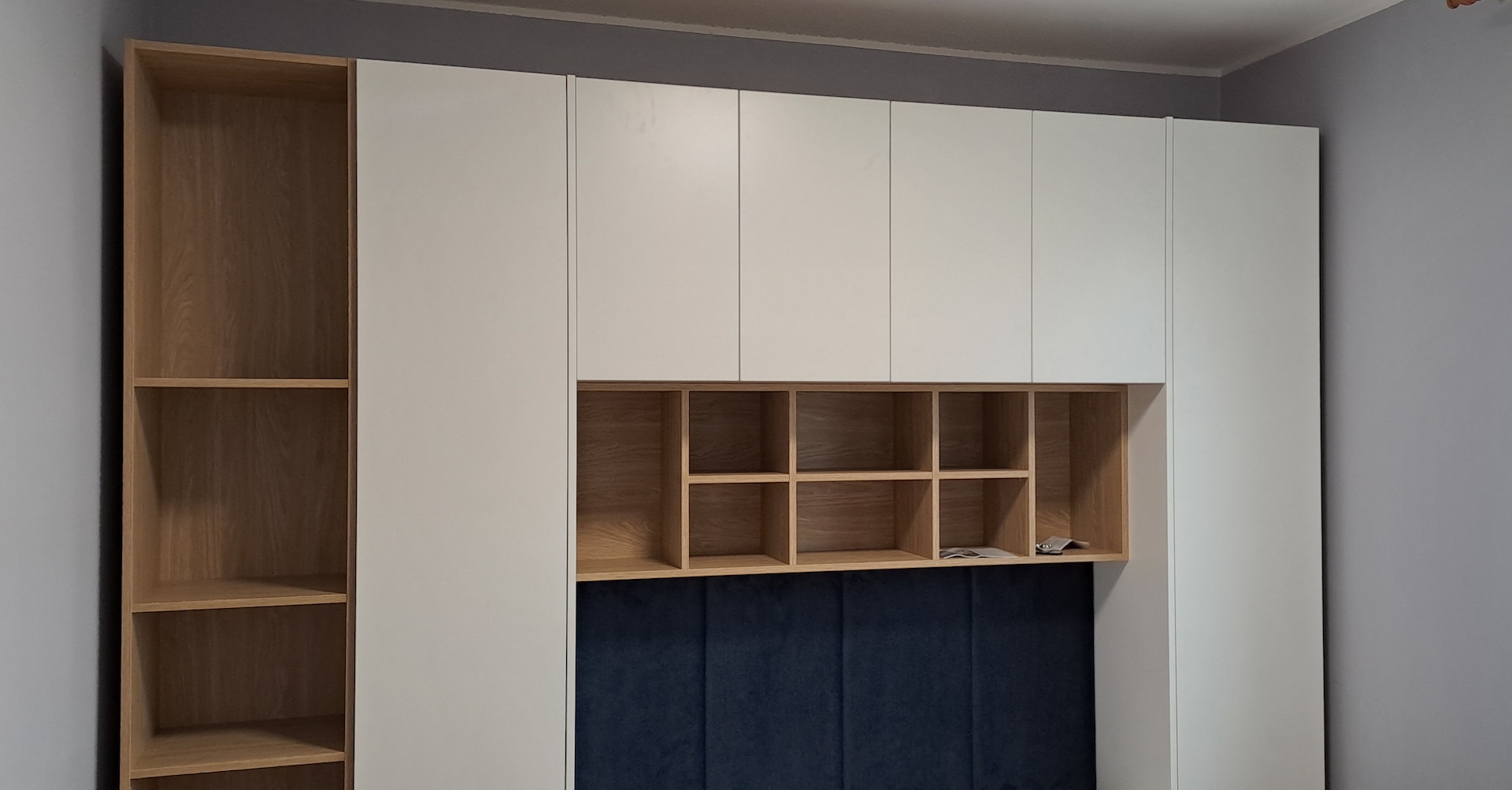 Na zdjęciu powyżej przykładowy zestaw: Szafa 35 z półkami + regał 45 z półkami + regał 30 z półkami + szafa 45 z wysuwanym blatem + baza 178 (do łóżka 160x200) + szafa 45 z wysuwanym blatem + szafa 35 z półkami + szafa 97,4x97,4 narożna + szafa 90 z półkami i drążkami + regał 30 zewnętrzny prawy (w zabudowie umieszczono łóżko tapicerowane MINI MAXI 2100 160x200 bez pojemnika, a nad meblami została zastosowana blenda maskująca górna) = łączna szerokość zabudowy: 510,4 cm na głównej ścianie i 217,4 cm na ścianie po prawej stronie.