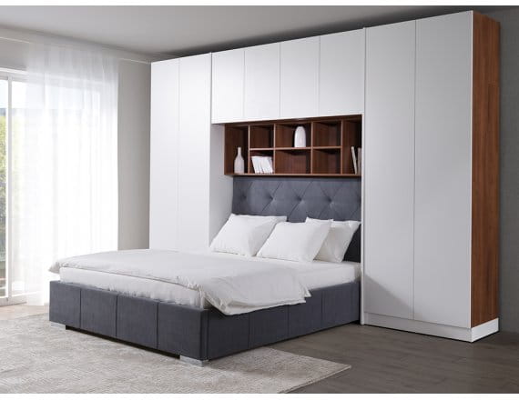 Zabudowa do sypialni SLEEP VARIA z bazą bez stolików nocnych oraz z szafami i regałami do wyboru (fronty w połysku)