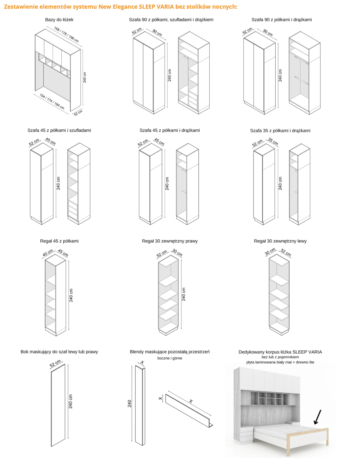- głebokość zestawu 52 cm, wysokość 240 cm.