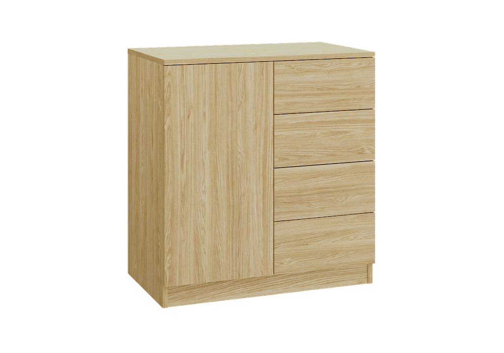 Wariant matowy:Kolor korpusu/wnętrza: Dąb olejowany / Kolor frontów: biały mat lub dąb olejowany / Widoczne elementy bazy w kolorze : Dąb olejowany. Komody całe białe, dąb olejowany lub grafitowe.
