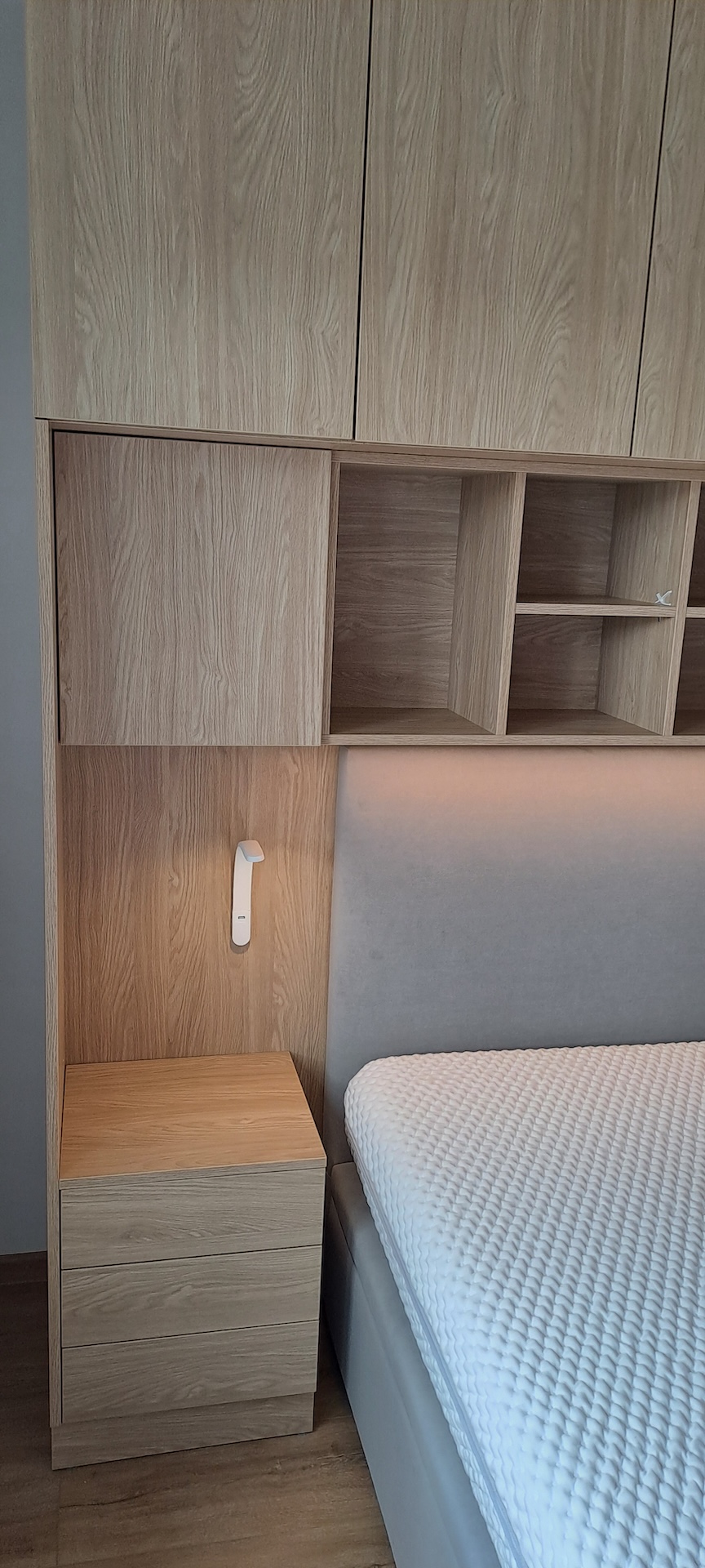 *Jeśli posiadasz własne łóżko i chcesz do niego dokupić oferowaną zabudowę, zmierz dobrze jego całkowitą szerokość oraz wysokość wezgłowia, a następnie porównaj z podaną powyżej szerokością i wysokością wnęki, aby upewnić się czy łóżko będzie pasować.