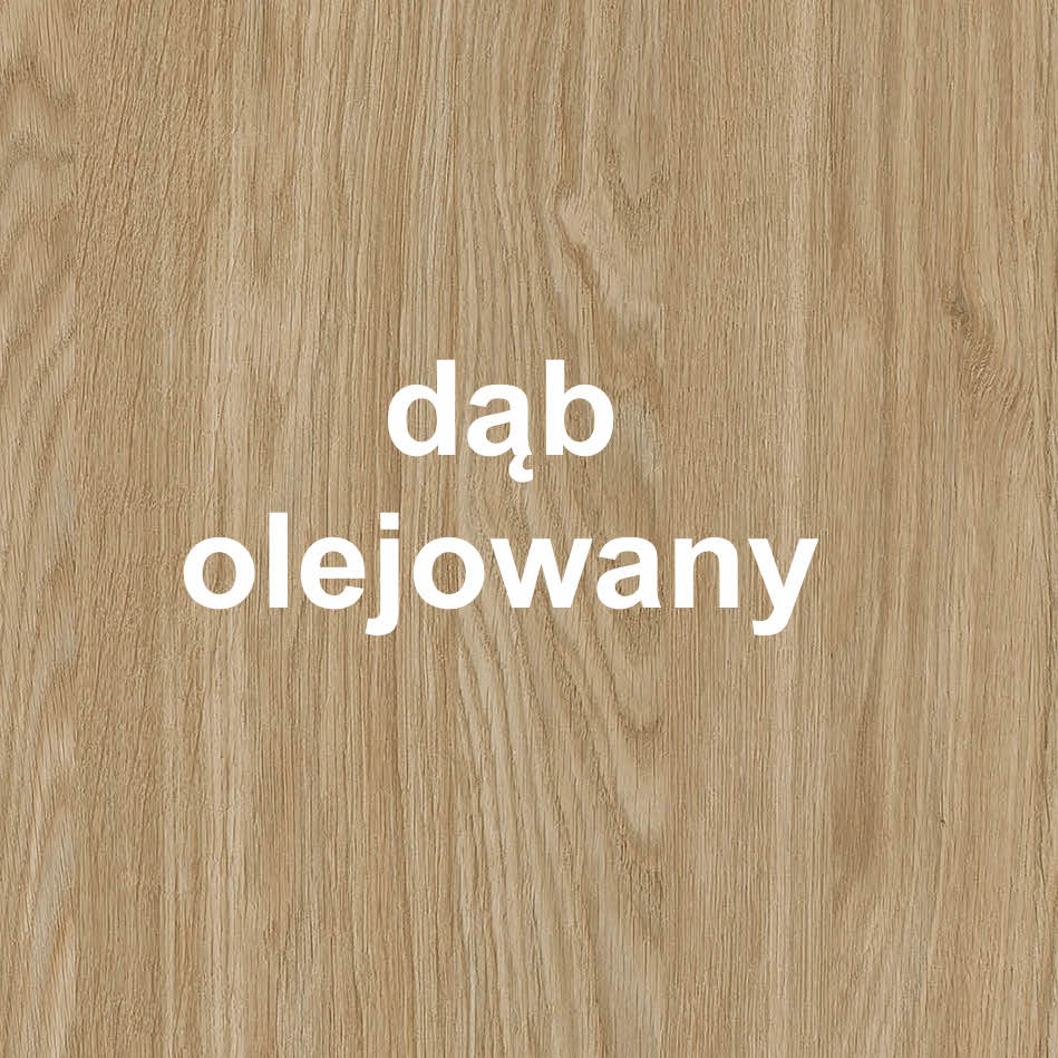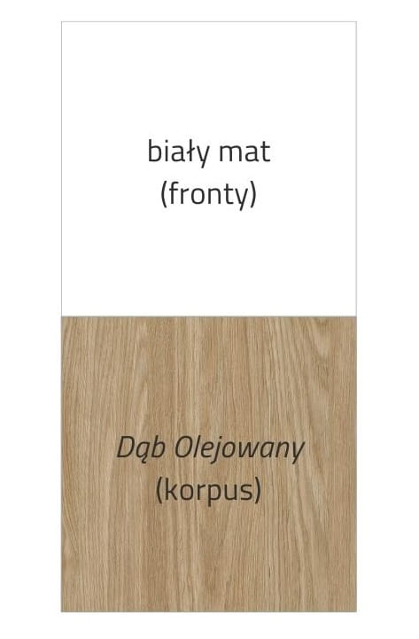 Wariant matowy:Kolor korpusu/wnętrza: Dąb olejowany / Kolor frontów: biały mat lub dąb olejowany / Widoczne elementy bazy w kolorze : Dąb olejowany.