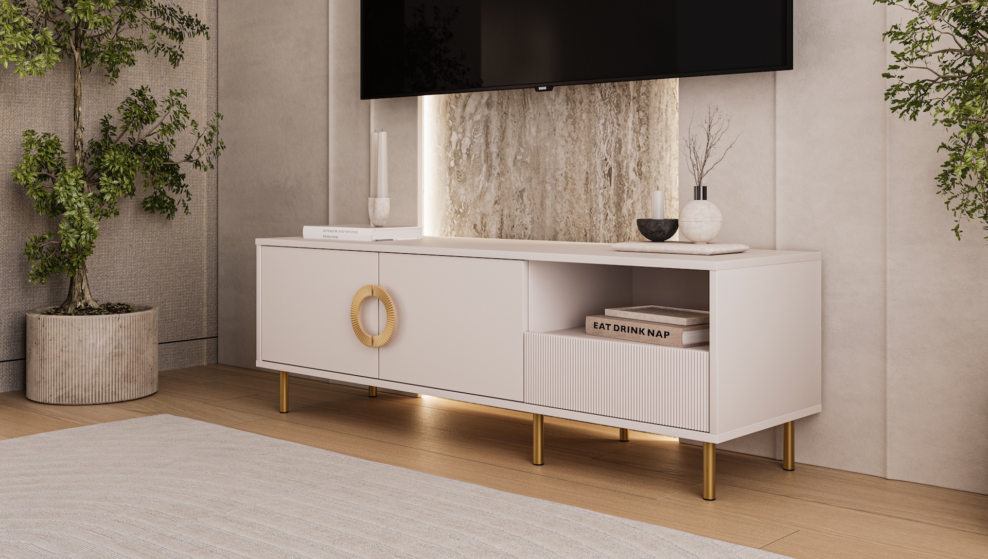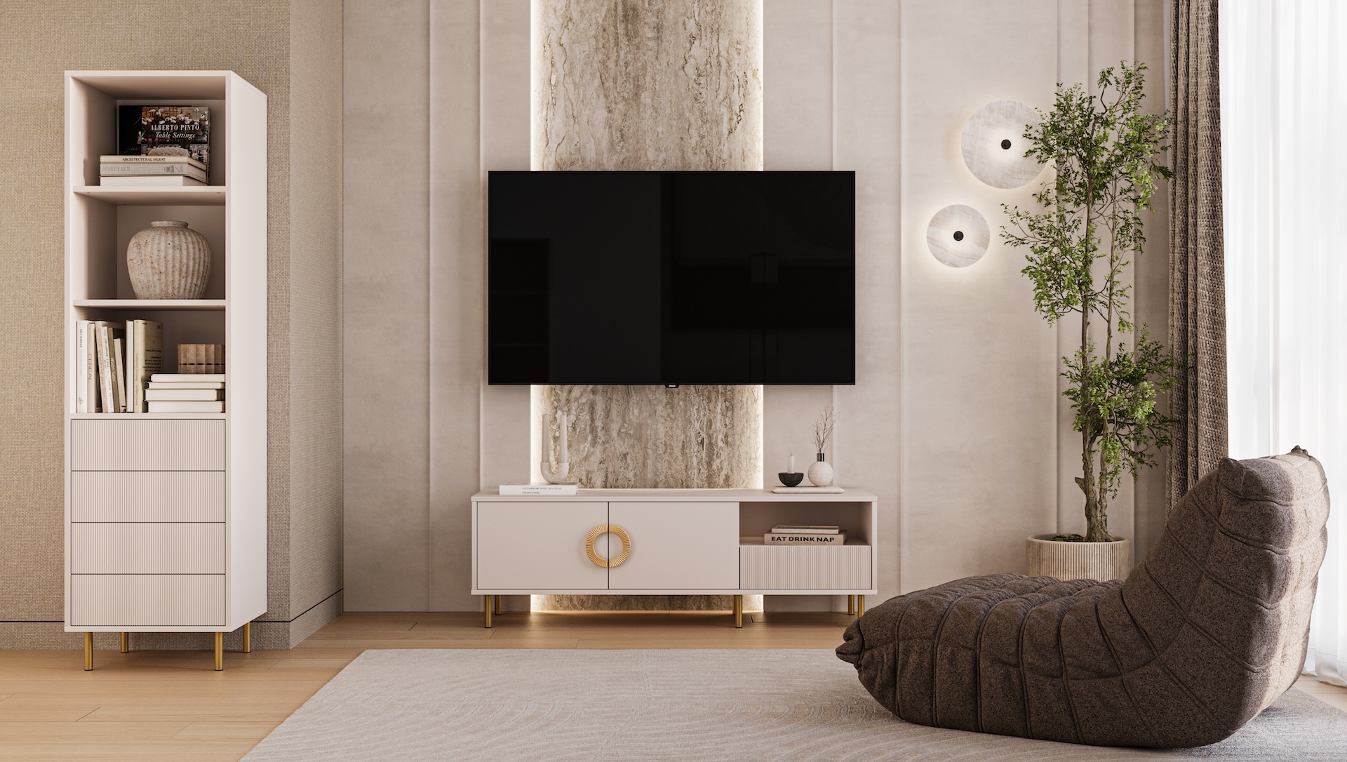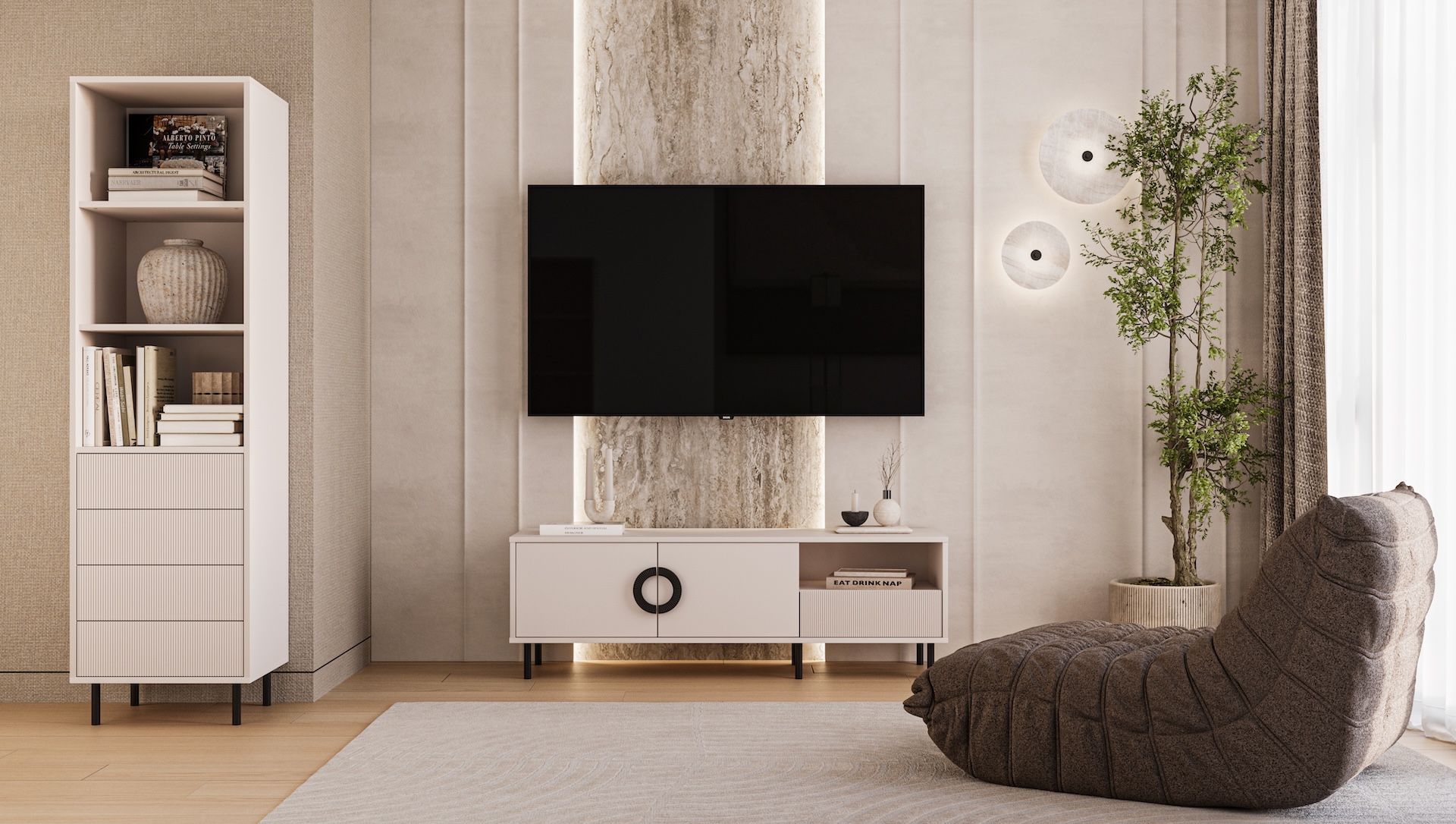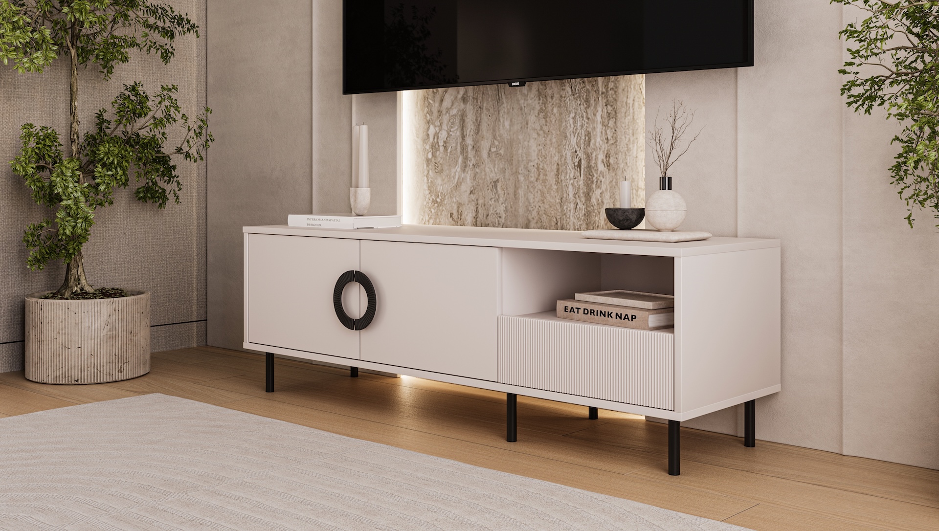 wykonana z płyty laminowanej Kaszmir Pfleiderer + czarne stelaż/nogi metalowe.Minimalistyczna, a jednocześnie wyrazista. Szafka RTV z kolekcji Nubo to propozycja dla tych, którzy cenią czystość formy i perfekcyjne proporcje.